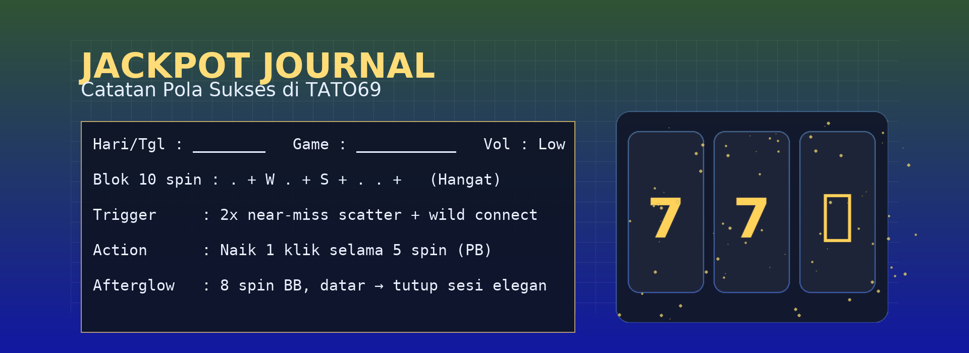 10–12 spin untuk mengukur mini-hit rate, near-miss scatter, dan wild connect. Tujuan: kumpulkan 1 sinyal kuat (mis. 2 indikator muncul berdekatan). -
